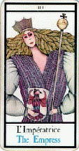 一方、「女帝」のカードは女性の現実面を示すカードで、一般的には妊婦で表されていて、母性を示します。惑星で言う月の示す母性というよりも、もっと現実面での母性で、実際に母親になるカードですから、もちろん女性としての喜び(愛し、愛されること)を知っていますし、華やかさも同時にもっていて、「いつくしみ、育む」という女性の持つ満足感を示しています。ですから、一般的には女性はみなさん、「女教皇と女帝はどちらが好きですか?」と聞くと大抵の方は女帝を選びます。